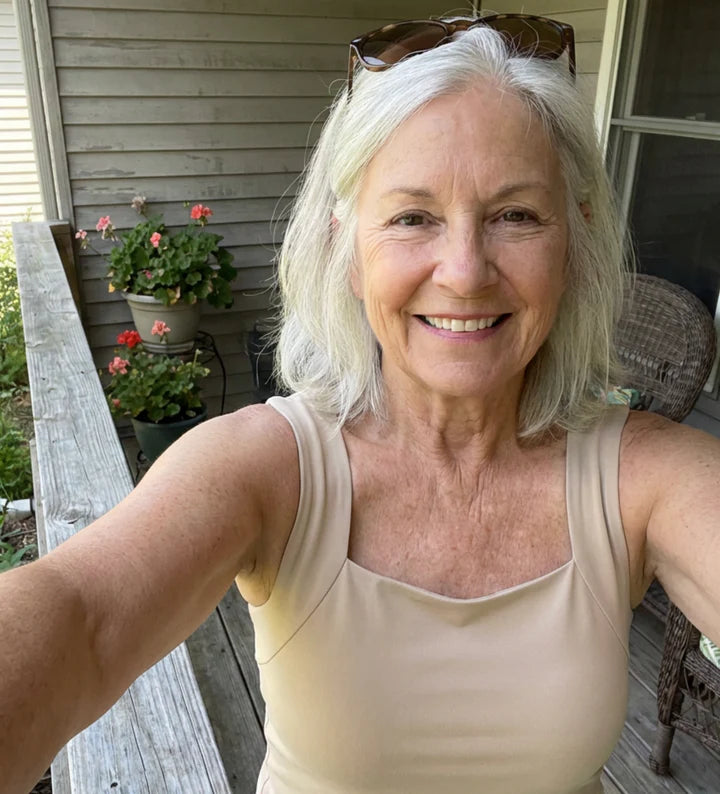 "Just finished 3 hours in my garden and I'm still comfortable! 😊 No bra digging into me, no straps falling off my shoulders. This tank is all I wear now. 72 and finally found something that works!"